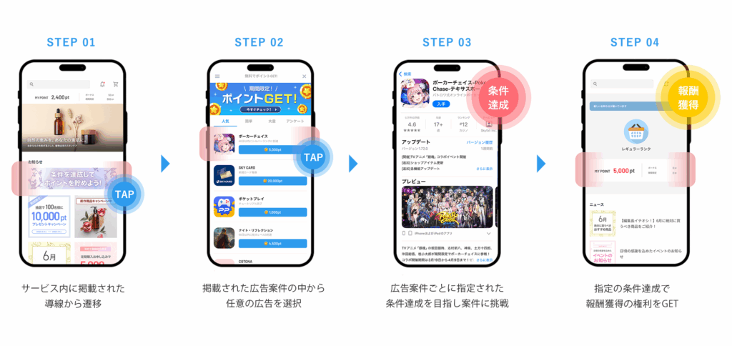 掲載されたオファーの中からユーザーが特定のアクション(アプリのインストール、アンケート回答、無料トライアル登録など)を完了することで、webサービスやアプリ内で活用ができるポイントやアイテムなどの報酬を得られる仕組みとなっています。